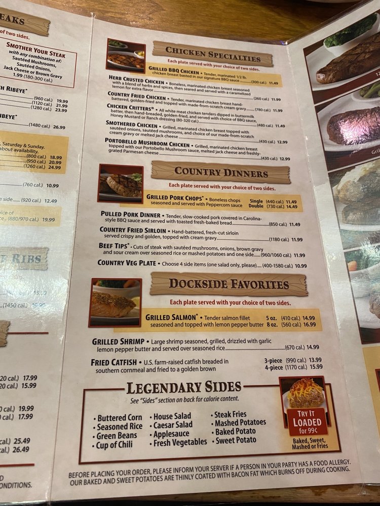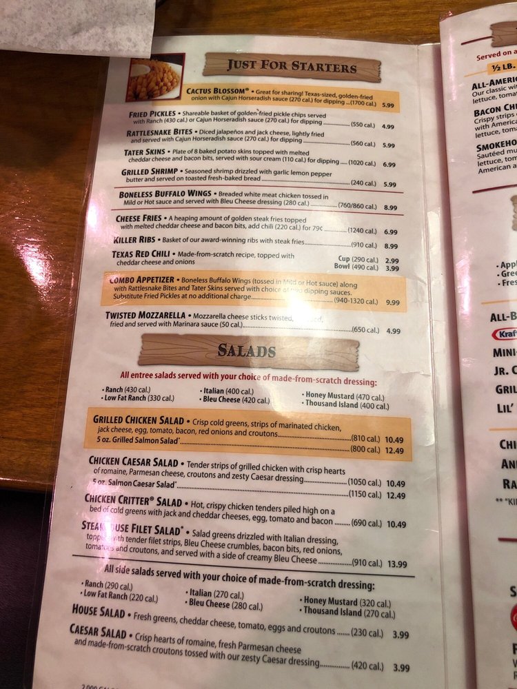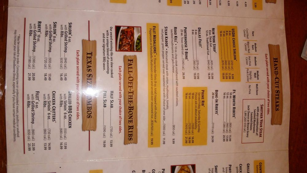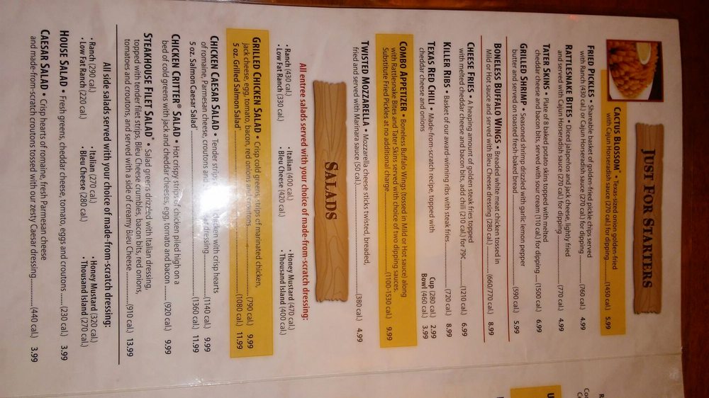 Begin your meal with enticing Just For Starters, like the crispy Tater Skins or the shareable Cactus Blossom. The hand-cut steaks are the stars of the show, featuring options like the juicy Bone-In Ribeye and the tender Dallas Filet, each served with your choice of two sides. For those craving something smoky, the Fall-Off-The-Bone Ribs are slow-cooked to perfection.